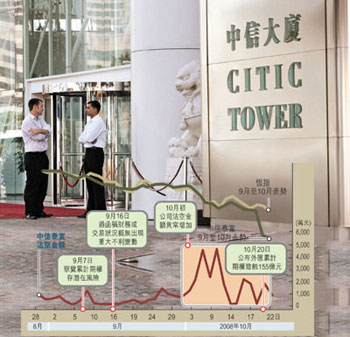 中信泰富股價繼21日急挫55%后,22日再挫逾24%。(圖片來源:文匯報)