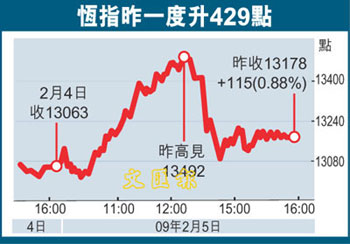 中新網2月6日電 據香港《文匯報》報道,雖然周三美股跌121點,但港股5日在中資股,特別是中資金融股的推動下,曾升429點,收報13178點,升115點或0.88%,成交額較4日激增近50%至528.32億元,為今年1月中以來最多。