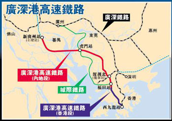 據(jù)悉,廣深港鐵路香港段的總長(zhǎng)度為26公里,日后將以雙管道行車(chē)。