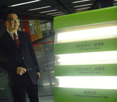 港鐵去年初耗資四百萬港元,在港島、荃灣及將軍澳三趟市區地鐵列車進行車廂LED環保燈測試計劃,港鐵總結稱,測試收到良好效果,除能有效節省能源外,LED燈的壽命較傳統光管耐用高四倍,達五萬小時,且更換時只需換走芯片便可,不會釋放水銀和制造光管垃圾。同時LED光線更接近自然日光,并不會釋放紫外光,可保護乘客眼睛,在測試期間廣為乘客歡迎。