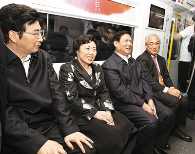 香港運輸及房屋局局長鄭汝樺與(由左至右)北京市市長郭金龍、北京市委書記劉淇和港鐵公司主席錢果豐博士試坐地鐵。(圖片來源:文匯報)