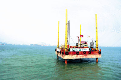 港珠澳大橋香港口岸展開詳細勘探工程,工人將管道插入海床,抽取泥土樣本測試堅固度及化學物含量,為填海工程做前期工作。(圖片來源:香港文匯報)