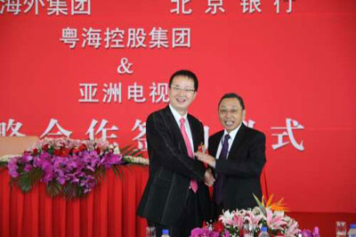 簽署儀式11日早在北京飯店舉行,由亞視行政總裁胡競英跟中國人壽、招商銀行、中國海外集團、北京銀行、粵海控股集團五間企業的高層簽署戰略合作協議。查懋聲、多位亞視高層、過百名政商界人士出席,場面熱鬧。王征以主持身份逐一介紹嘉賓,并由查懋聲首先致詞。
