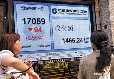 匯控結束一連9天的升勢,全日跌3.3%,報65.1元,成交27.2億元,單是匯控已令大市跌118點。即月期指報16930點,跌258點,低水130點。資金由金融股流出,轉炒資源股,中海油全日升5.5%,招金升8.4%。另外,內地樓市回暖,多只內房股如合生全日股價升逾10%,綠城升6.6%,奧園升11%。