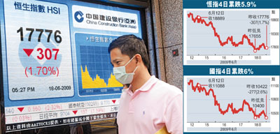 中新網6月19日電 據香港《文匯報》報道,港股連續第4個交易日下跌,恒指18日剛開市便急挫,失守18000點大關后,瞬即落至全日最低位17655點,連17700點也守不住,午后跌幅雖一度收窄,但臨收市沽壓又再度重現,全日收報17776.6點,跌307.9點,成交額639億元。