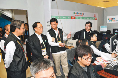 另外,曾蔭權上周末巡視東亞運動會部分比賽場地,了解各項籌備工作并觀看彩排。在灣仔伊利沙伯體育館,特首特別巡視了東道主廣播機構香港電臺的直播中心,了解賽事電視訊號的技術安排。署理廣播處長梁松泰及助理廣播處長張文新,向特首重點介紹香港電臺為東亞運提供的廣播技術支持及投入的資源。
