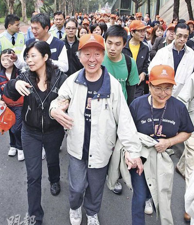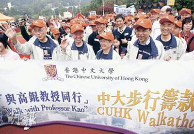 中大14日舉行“與高錕教授同行”籌款日,開步禮除了有高錕伉儷為主角外,中大多名重量級人士,包括校董會主席鄭海泉、兩位前任校長馬臨及金耀基也有參加,現任校長劉遵義也與新婚太太麥嘉軒十指緊扣一同步行。