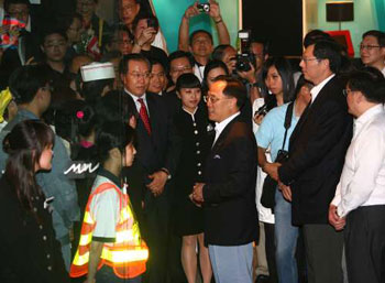 港府在發現首宗甲型流感個案后即將患者入住的維景酒店封鎖,令疫情無法擴散。圖為曾蔭權在維景解封當日到場感謝酒店員工及旅客。(圖片來源:大公報)