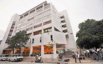 六月十六日上午,穿著保護衣的防疫人員到香港灣仔鄧肇堅維多利亞官立中學校園進行清潔。該校有學生確診感染H1N1流感后,當局宣布即日起停課兩星期。 中新社發(fā) 張勤 攝