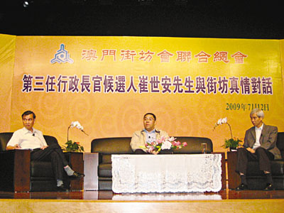 中新網(wǎng)7月13日電 據(jù)香港《文匯報(bào)》報(bào)道,澳門行政長(zhǎng)官唯一候選人崔世安發(fā)表參選政綱后,隨即到各大社團(tuán)介紹政綱。12日他到澳門街坊會(huì)聯(lián)合總會(huì),向逾400位街坊推介政綱兼真情對(duì)話。