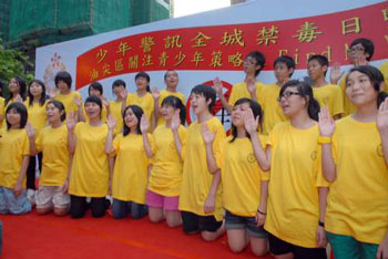 香港油尖警區禁毒宣傳活動,超過100名青少年及少年警訊會員一起參加誓師儀式,承諾遠離毒品。(圖片來源:大公報)