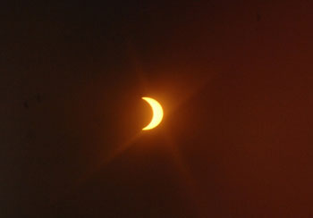 最大食分在約9時15分出現(xiàn),四分之三的太陽被陰影遮蓋,濾光片下的太陽仿如一彎新月。但天色并沒有出現(xiàn)昏暗,因為要太陽被遮近九成半,才會出現(xiàn)天氣突然變暗的現(xiàn)象。