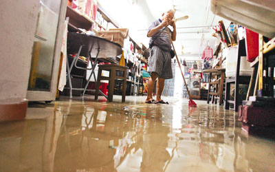 商店林立的永安街的商鋪無一幸免,一間海味商店被倒灌海水“攻陷”,后門涌水前門出,有士多店老板因人手不足,海水急湍淹至店內,貨品和電器被浸壞須報銷,粗略估計損失2至3萬元;另有海味店東主表示得悉臺風襲港已提早一天做好防水準備,將貨物擺放至更高的位置,但店內仍然有不少貨物被浸爛,料損失大約1萬元的貨品。