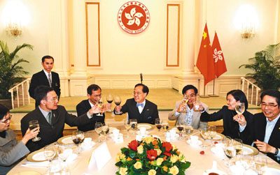 曾蔭權(quán)5日在禮賓府筵開5席,來自各黨各派的約40名議員依時(shí)赴會(huì),財(cái)政司司長曾俊華、律政司司長黃仁龍及大部分局長和副局長也同為座上客。據(jù)引述,曾蔭權(quán)在午宴上致辭時(shí)向議員們笑說,議事之外都有人情,火花之外都有風(fēng)花雪月,5日的宴請是希望大家除了公事之外,也有多些溝通和交流。