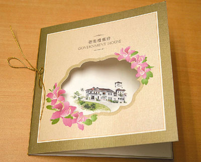 該賀卡由特區政府新聞處設計,封面是香港市花洋紫荊襯托下的禮賓府全景油畫,卡內寫上“恭賀新禧”及“Wishing you a Happy and Properous New Year”,并由曾蔭權簽名,誠意十足。