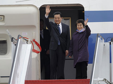 在胡錦濤主席專機(jī)抵達(dá)澳門機(jī)場(chǎng)后,澳門特區(qū)現(xiàn)任特首何厚鏵及夫人走上舷梯并進(jìn)入機(jī)艙,歡迎胡錦濤主席訪問澳門。胡錦濤主席在現(xiàn)場(chǎng)樂團(tuán)迎賓曲的曲聲中步下舷梯。
