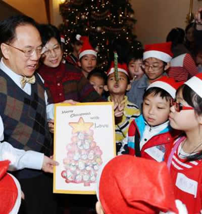 曾蔭權伉儷24日在禮賓府舉行了一個圣誕派對,邀請40多位來自深水埗的小學生,擔任他的特別嘉賓,一同歡度一個溫馨愉快的早上。曾蔭權在博客中透露,自己與小朋友在圣誕樹前大合照,他們又送其一張巨型的圣誕卡,里面全是他們可愛的簽名和祝福,其中一句“祝你長命一點”更是“搶眼”:“小孩的直率和可愛,令我不禁失笑。”