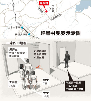 2時許,同事趕到坪輋村譚家時,發現一名可疑男子在石屋前泥地掘坑有所動作,感覺不妙,于是立即報警。其間疑人發現行藏敗露,立即跑到附近一間村屋匿藏。警員接報馳至,發現泥地上有可疑血漬,立即召消防到場協助,消防員將泥土的表層翻開,見2具男女大人,以及2具女童的尸體,由于4名死者已無生命跡象,警方立即封鎖現場,以待7日進一步挖掘調查。