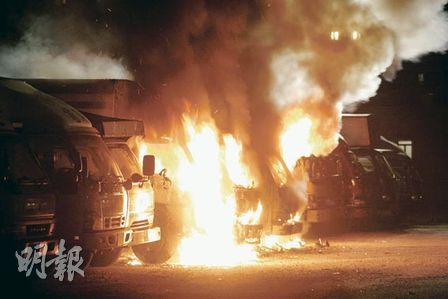 現場為何文田忠孝街56號的露天停車場,5輛被焚貨車并排停泊,部分車輛的駕駛室燒剩支架。其中一輛載有約40罐石油氣的貨車右車頭燒毀,幸貨斗內的石油氣未被波及,否則后果嚴重。