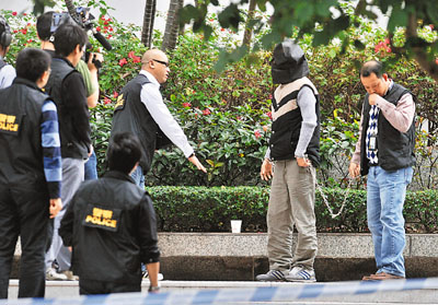 其中一名疑犯黑布蒙頭,腰間綁上鐵鏈,在灣仔區域法院對面重組案情。有組織罪案及三合會調查科探員在場調查,封鎖大廈出入口和附近行人路,并拍下整個過程。疑犯講述案發經過。