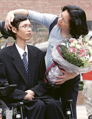 中新網5月9日電 有“港版霍金”之稱的劉曉鋒大學畢業后踏足社會,準備了他首項研究的成果作母親節禮物,報答媽媽的辛勞,他說﹕“沒有她照顧我,好多事都做不到!辈环謺円拐疹檿凿h26個寒暑的劉媽媽,卻從未視之為“辛苦事”。