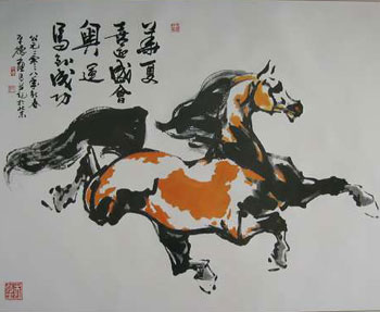此畫描繪了一匹奔騰向前的駿馬,頗具“馬踏飛燕”雄風。繪畫的技法雖屬中國筆墨寫意,但馬的比例結構卻是精準的良馬相,顯示出作者廣博的馬學知識及深厚的藝術功力。畫面行書題款為“華夏喜迎盛會,奧運馬到成功”,表達了中國人民此時此刻的美好心愿。馬身上的花斑中,細看有一幅中國地圖,更是明白無誤地象征著中華騰飛之意。