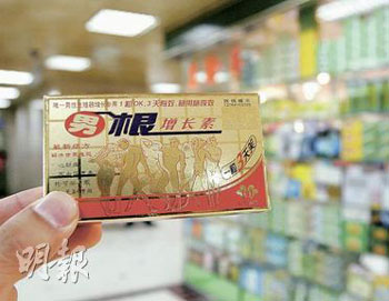 其中聲稱“1粒OK 三天有效……可增長陰莖”的壯陽藥“男根增長素”,因非法含有昔多芬及格列本脲,除在香港導(dǎo)致一名老人昏迷外,也曾在內(nèi)地多個省被政府查禁。