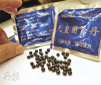 危險壯陽藥另一來源則是香港無牌賣藥小販,有入院長者透露曾于沙田及元朗區(qū)購得危險壯陽藥。記者上周三晚則在油麻地廟街發(fā)現(xiàn),一名流動小販賣賣色情玩具及壯陽藥“天皇固腎丹”,當(dāng)時小販聲稱這是純中藥成分補(bǔ)藥,絕無危險,可天天服用,還以100元4包的價錢賣藥給記者。