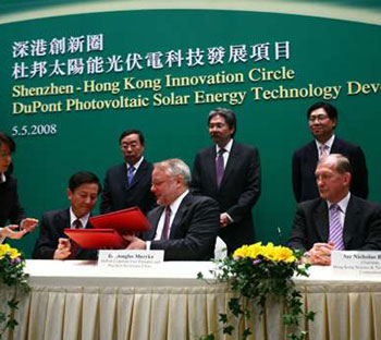 根據(jù)意向書,香港科技園公司會牽頭于香港科學園設立太陽能研發(fā)支持中心,以協(xié)助香港及珠三角地區(qū)發(fā)展太陽能及有關的科技,其中杜邦公司將會是首間落戶進駐該中心的公司,在科學園建立其全球光伏電薄膜業(yè)務研發(fā)中心。