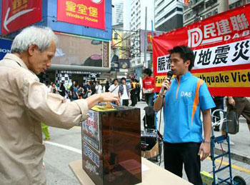 多個(gè)政黨、團(tuán)體和商業(yè)機(jī)構(gòu)均以不同方式參與賑災(zāi)行動(dòng),包括街頭和商場(chǎng)義賣、獻(xiàn)唱、大球場(chǎng)義賽等,市民紛紛慷慨解囊,祈求為災(zāi)民獻(xiàn)出一分力。