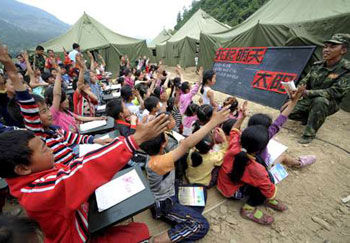 圖:災(zāi)區(qū)的臨時(shí)學(xué)校,成為孩子心靈的暫寄之處。(圖片來源:大公報(bào))