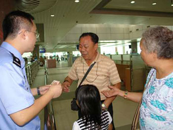 女童的“回鄉卡”過期無法出關,拱北邊檢民警向香港阿公阿婆解釋。(圖片來源:大公報)