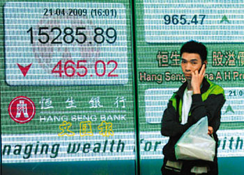 中新網4月22日電 據香港《文匯報》報道,美股大跌近300點,令港股21日裂口低開685點,是近期少見的大調整,匯控等一眾金融股成為跌市火車頭。下午港股跌幅收窄,全日收報15285點,跌465點,跌幅3%,為兩周來最大跌幅,成交縮至576.8億。
