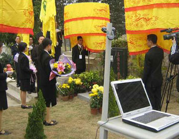 各種網絡祭祀、電視公祭等時尚現代的祭祀方式,正被越來越多的人重視和接受!凹漓氍F場、網絡直播”開播儀式日前在四會市聚福寶華僑陵園舉行。在現場,一邊由禮儀專員在墓碑前拜祭,另一邊則有兩臺計算機對整個拜祭過程進行同步直播。
