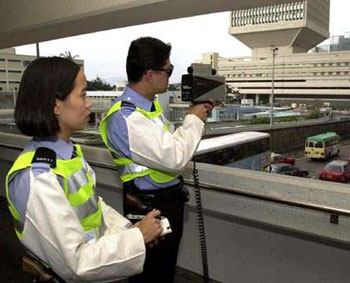 圖:警務人員操作一部激光槍在中區偵察超速車輛。(圖片來源:大公報)