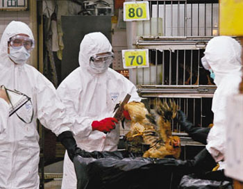 六月十一日,香港食環(huán)署人員穿著保護(hù)袍服到街市圍封活家禽零售點。漁護(hù)署當(dāng)天宣布由于在深水埗等四個街市的雞只樣本,化驗出H5N1病毒呈陽性反應(yīng),因此決定于全港街市屠殺活家禽。漁護(hù)署表示,病毒源頭不排除是走私雞。 中新社發(fā) 譚達(dá)明 攝