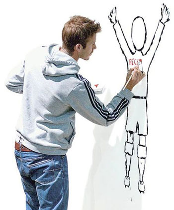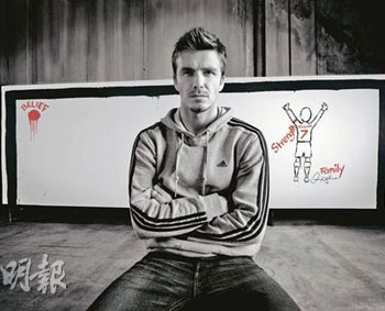 貝克漢姆在某廣告中即席揮毫,畫了《圓的世界》。(圖片來源:明報)