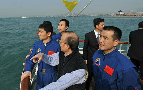 (左起)航天員劉伯明、景海鵬和翟志剛乘船參觀維港。