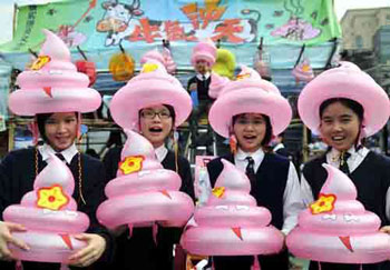 張祝珊英文中學(xué)第三度出戰(zhàn)維園年宵,兩班中四商科同學(xué)約60人,投資約7萬元售賣1500頂“牛屎帽”。同學(xué)們穿上校服、戴上自己的創(chuàng)意產(chǎn)品叫賣,數(shù)字同學(xué)還齊聲發(fā)出祝福呼聲:“牛氣沖天”,并說“牛屎等如牛市”,在股市疲弱下,這番話令股民特別醒神。