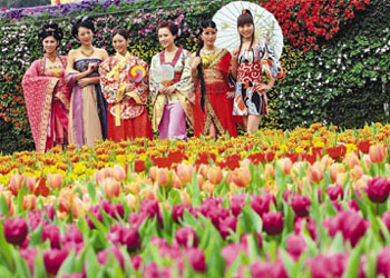 今年花展設有多個別致景點,包括以超過1.5萬株郁金香鋪設而成的逾190平方米的圓形花海,主辦方還首次設立T形觀景花臺,本星期六、日還有兩場以體育服裝及婚紗為主題的時裝表演。