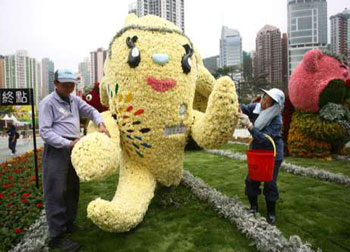 香港康文署主辦的2009香港花卉展覽由13日至本月22日在維園舉行。為配合迎接東亞運動會的主題,現場放置用4萬株花卉嵌植成的大型展品“萬花喜迎東亞運”,配合煙花、奧運五環等花卉組圖,烘托出喜迎東亞運動會的氣息。