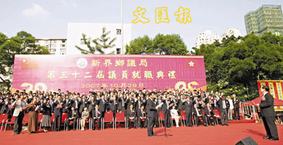 香港新界鄉(xiāng)議局新一屆議員就職典禮昨日(29日)在荃灣舉行,大會安排了502席盆菜,供來自全港的鄉(xiāng)紳享用,而出席嘉賓可謂冠蓋云集,有大會監(jiān)誓人、特首曾蔭權(quán),中聯(lián)辦副主任周俊明,外交部駐港特派員呂新華等以及多名港區(qū)全國人大代表。