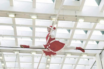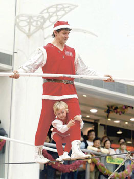 據香港明報報道,一行8人的衛氏家族成員,昨(6日)于香港大埔商場作高空表演。在半小時表演內,衛氏家族成員粉墨登場,一家大小扮成圣誕老人。帶領家族成員的Peter Mario,先以一個“筋斗”給觀眾一個見面禮,再來一招“倒豎”,這些動作看似簡單,但卻是在高空13米、離地近兩層樓高的鋼在線進行。