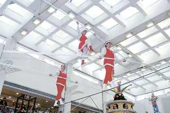 25歲的Jasmine是Peter的女兒,昨天她表演在鋼在線推手推車,走過10多米的距離。樣貌標致的Jasmine,一面手執平衡桿,面帶笑容走過腳下的幼絲,臺下的觀眾卻為她“一步一驚心”。Jasmine說,她曾試過離開表演事業,在外另覓工作,但始終心系腳下這條鋼線。“始終一家人 能一起工作,獲得安全感和快樂,是外面找不到的,而且我熱愛演出。”(周淑蘭)