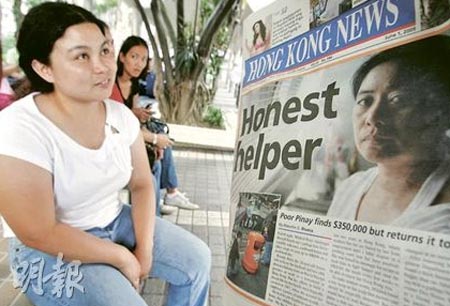 據(jù)香港《明報》報道,離鄉(xiāng)別井為兩餐,從菲律賓來港謀生的女傭Mildred Perez,不甘雇主對她做出的不法行為,訴諸法院,在候?qū)徠陂g不能另找工作,只靠拾荒維生,每天掙約38元生活費。有一天,她意外地得到一個可擺脫貧困的機(jī)會——在垃圾堆中拾獲35萬元巨款,但她把錢全數(shù)退還失主,雖然換來的只是一盒曲奇餅作答謝,但她并無后悔,繼續(xù)其撿破爛的日子。