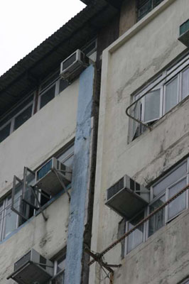 現(xiàn)場為大角嘴橡樹街九十號橡樹樓,樓高十一層,有三十四年樓齡,與隔鄰的廣和大樓緊貼。據(jù)街坊表示,兩幢大廈之間在大約二十年前,已出現(xiàn)一條明顯裂縫,但未有發(fā)現(xiàn)大廈結(jié)構(gòu)出現(xiàn)問題。