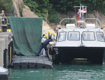 “華天龍”號吊起烏克蘭補給船的殘骸后,將最后一名失蹤船員的遺體尋回警方將最后一名船員的遺體送上岸。(圖片來源:文匯報)