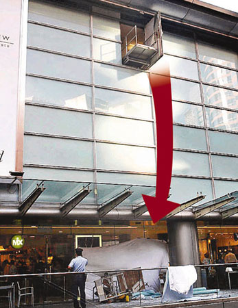 事出突然,工人還沒有來得及跳出逃命,便連人帶鐵斗擊中1樓的玻璃檐篷,因撞擊力以噸計,強化玻璃也應聲粉碎化作“玻璃雨”,與吊船一起跌下平臺。