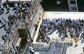 香港救人英雄蕭永方及陳兆龍不幸殉職,約170人14日到火場招魂致祭,由于人數太多,各人分別站到發生火警的嘉禾大廈(右)及永如大廈(左)天臺,列隊向英靈上香致意。(圖片來源:明報)