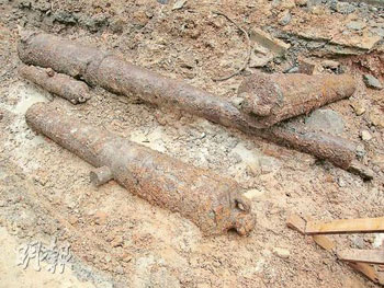 中新網9月19日電 據香港明報報道,香港金鐘英國駐香港總領事館對面地盤,挖出4支共重3噸的生銹大炮。爆炸品處理課人員檢查后,證實為沒有殺傷力的戰前古炮。